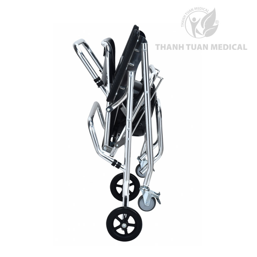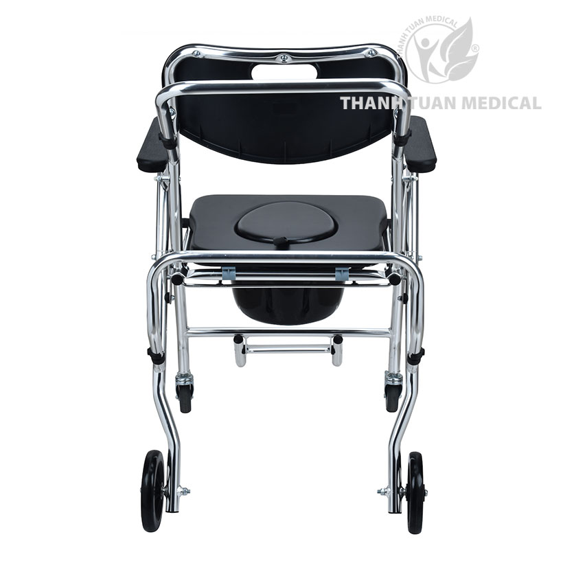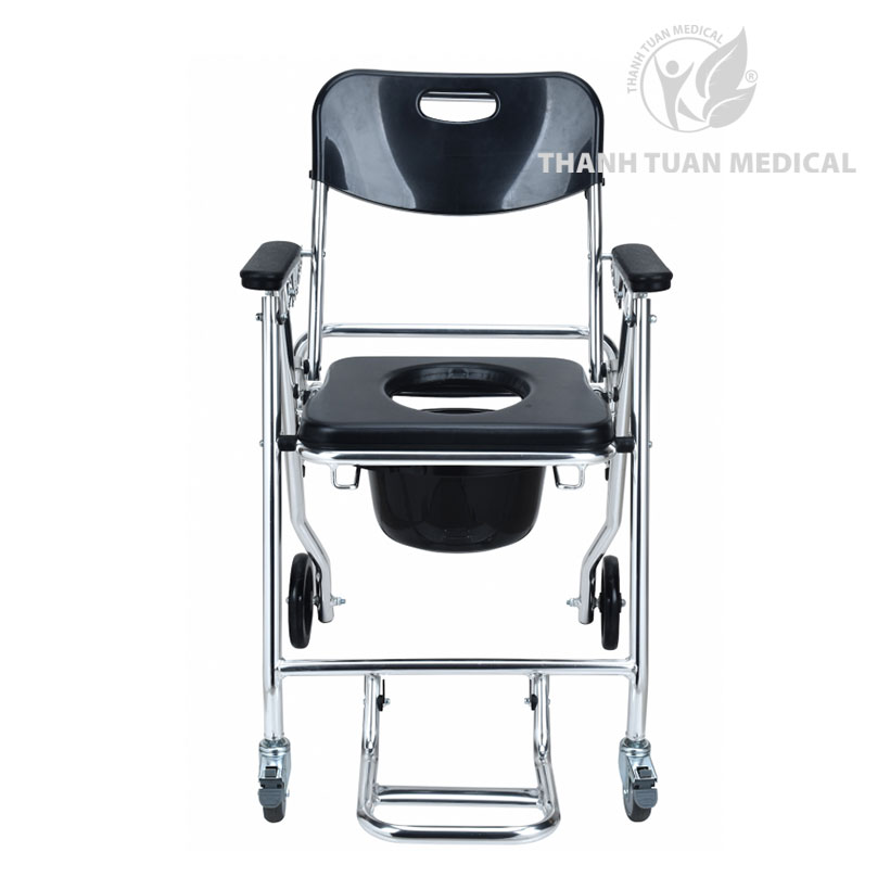 Ghế bô tắm vệ sinh GBM-051 gồm 4 bánh xe, 2 bánh xe có đường kính lớn 15cm giúp đẩy nhẹ hơn, hai bánh trước có khóa bánh để cố định máy chắc chắn.