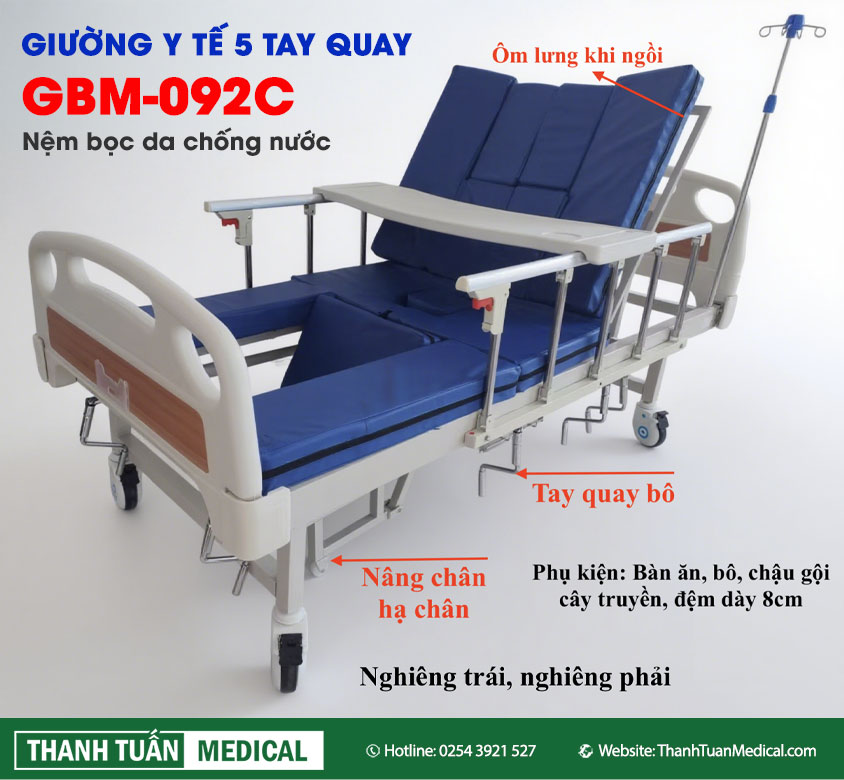 Giưá»ng bệnh y tế GBM-092C là má»™t sản phẩm tiên tiến được thiết kế vá»›i 5 tay quay Ä‘iá»u chỉnh linh hoạt, giúp bệnh nhân có thể thay đổi tư thế dá»… dà ng và thuáºn tiện. Vá»›i công nghệ sản xuất từ Nháºt Bản, sản phẩm nà y không chỉ mang lại sá»± thoải mái cho bệnh nhân mà còn đảm bảo tÃnh năng tiện dụng, an toà n và độ bá»n cao.