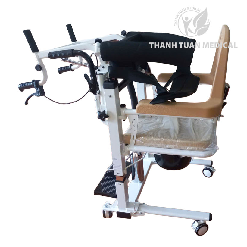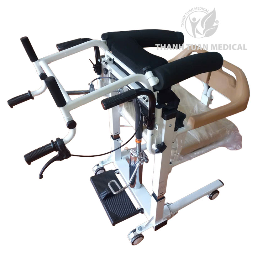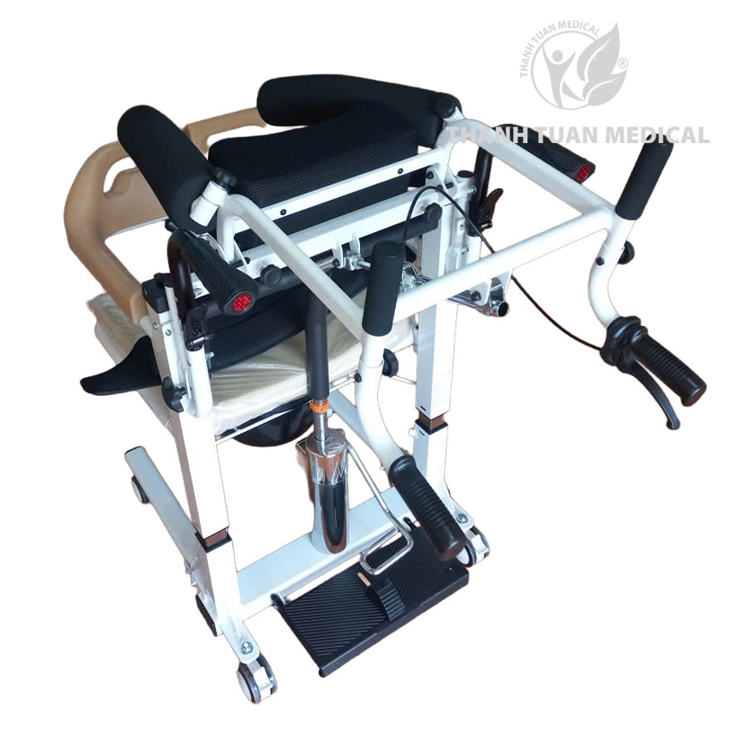 - Xe nâng bệnh nhân đi tắm, có thể đẩy xe và o bồn cầu để đi vệ sinh trực tiếp xuống bồn cầu.