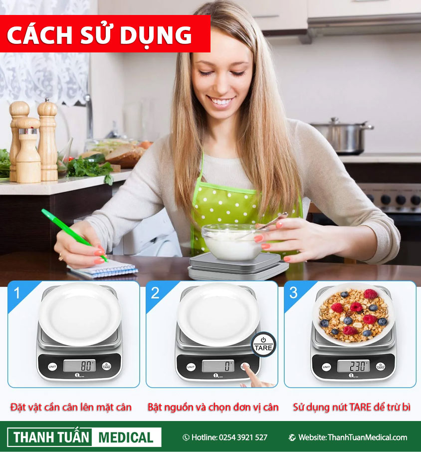 - Sá» dụng nút TARE để trừ trá»ng lượng bát hoặc há»™p.