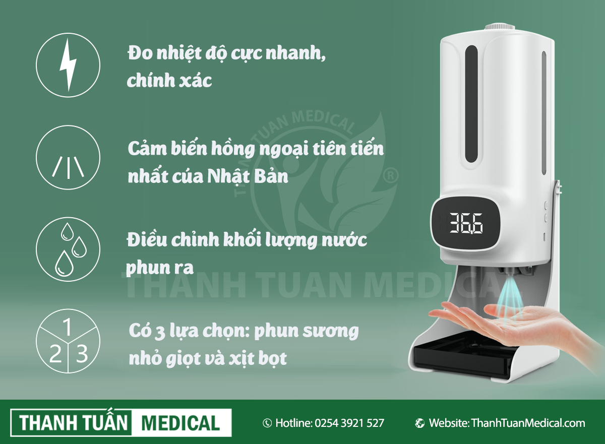 - Chức năng: Khử trùng tay và đo nhiệt độ
